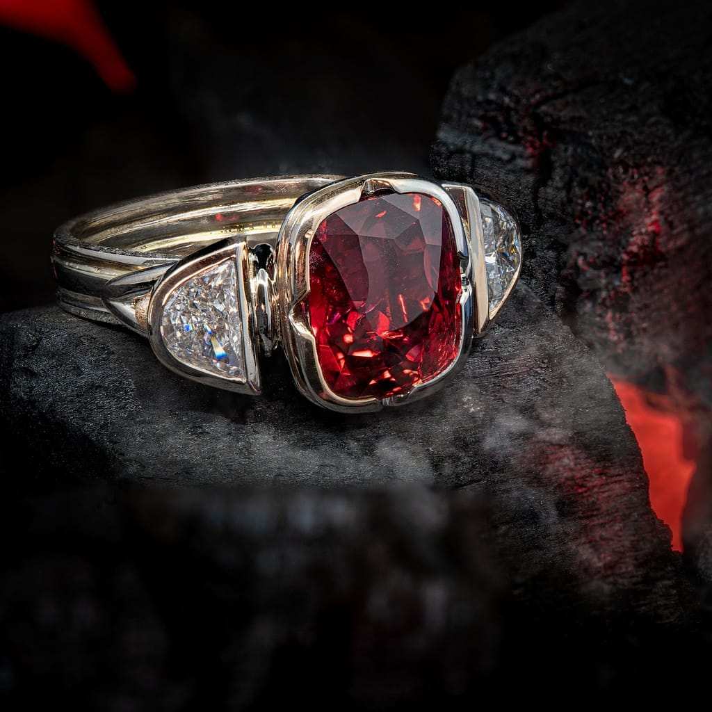 This magnificent Burmese red spinel is set off by two half-moon diamonds, mounted on a ring body whose red and white gold wires have been twisted and subtly revealed by a polished/milled effect.