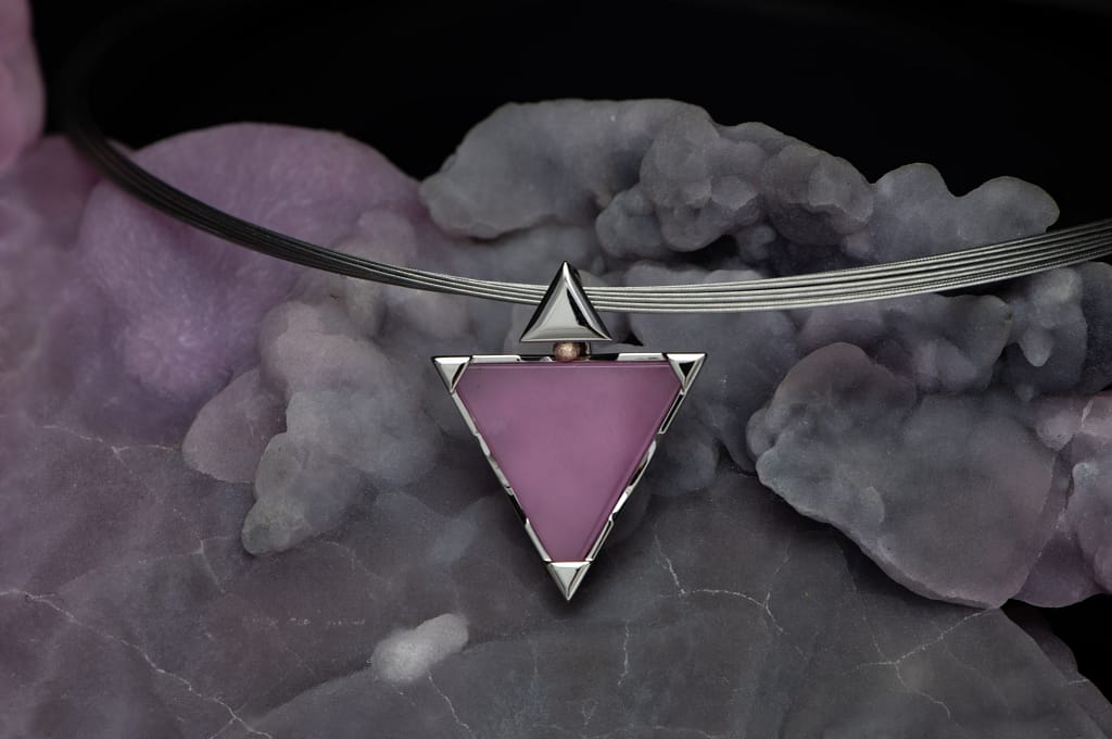This beautiful 15.04 cts triangular Rose de Mine is set in a polished white gold pendant with milled red gold bead.