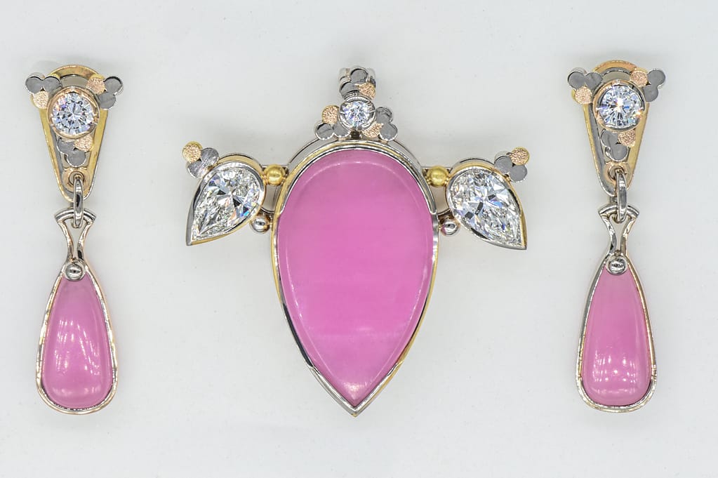 Cet ensemble pendentif et boucles d’oreille en Roses de Mine et diamants est mis en valeur par un serti original en fil or gris et or rouge torsadé, poli et fraisé.