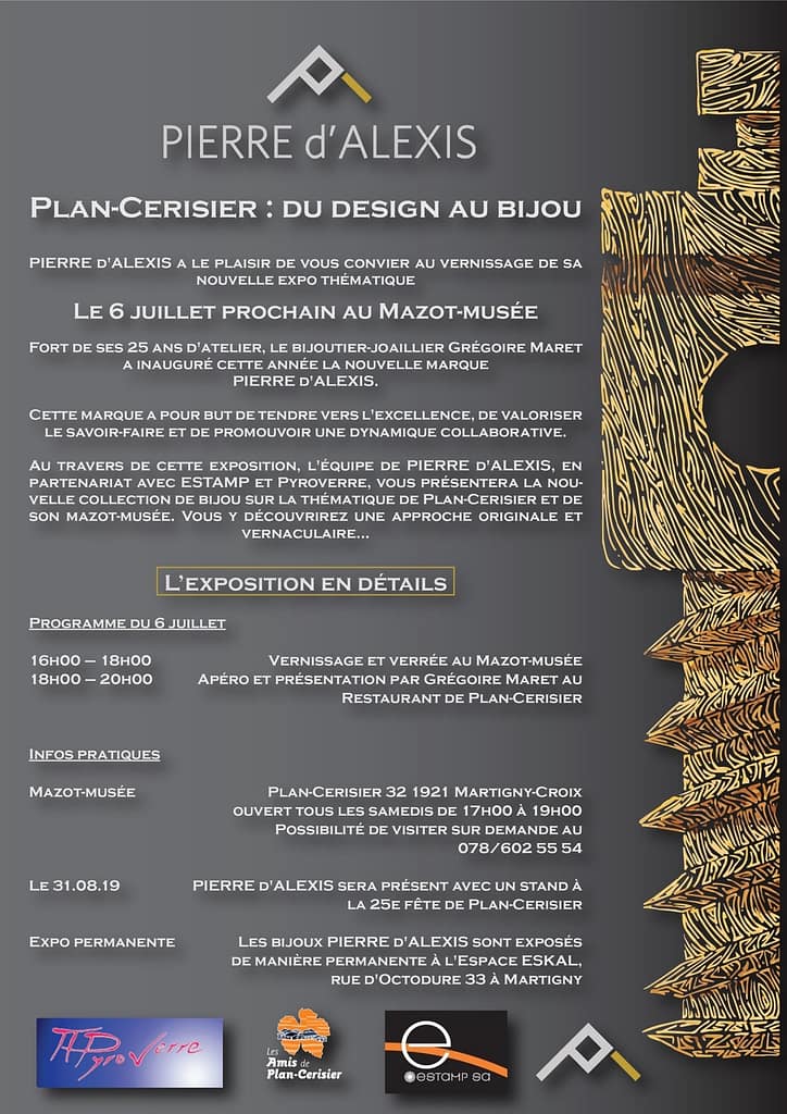 Nous remercions « Les Amis de Plan-Cerisier » qui nous accueillent au mazot-musée dès le 6 juillet et jusqu’au 31 août prochain, date de la Fête annuelle de Plan-Cerisier, ainsi que le Restaurant de Plan-Cerisier qui exposera les designs originaux, ainsi que des photographies durant toute cette période